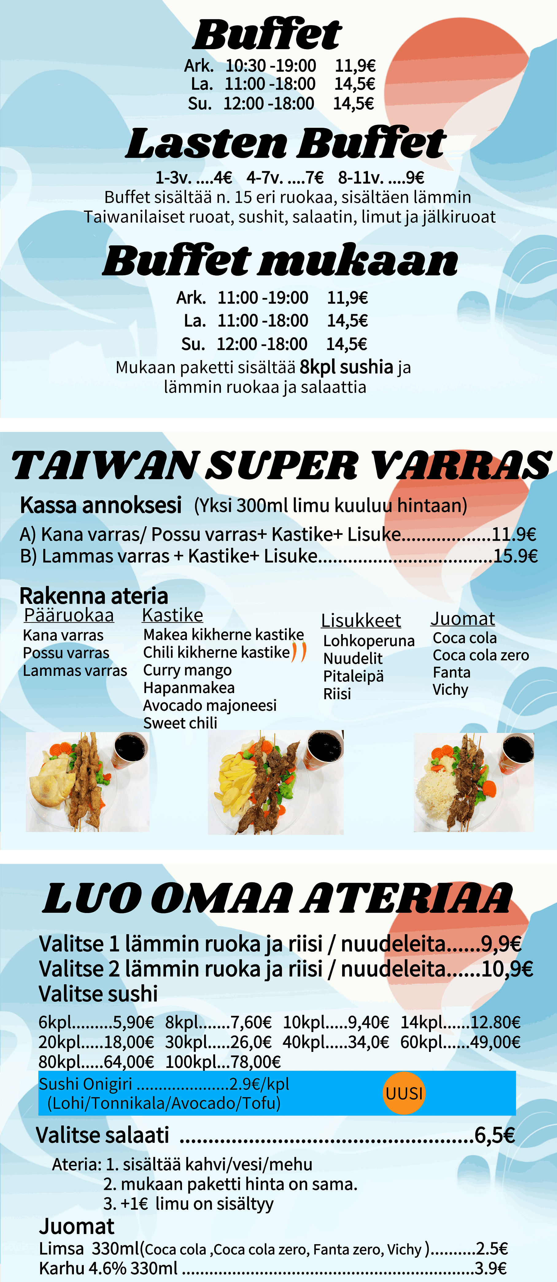 Buffet table offers various taiwan special food, including chashao pork, gulao chicken, crispy fried chicken, dumpling, spring rolls etc.Besides that, you may also get colorful salad and different types of fresh sushi.